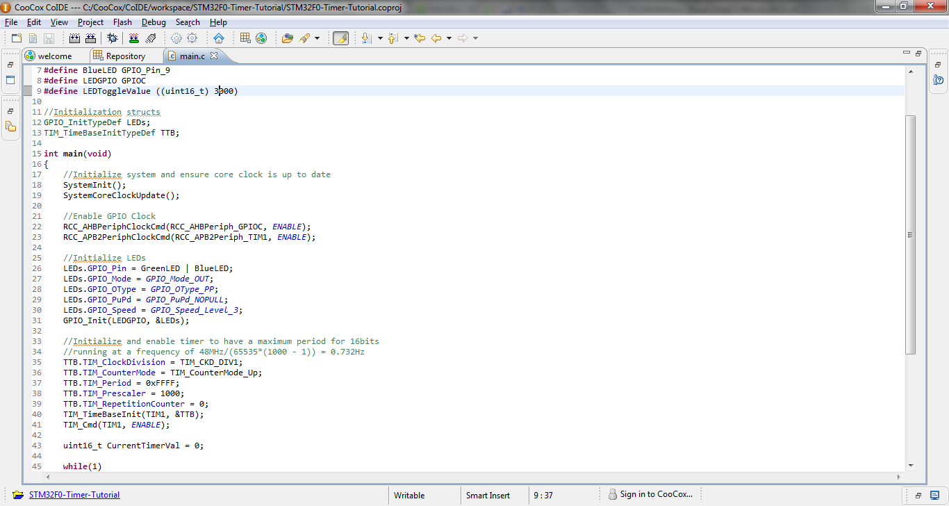 The final code! If you want to maximise your current window in CooCox, double click on the tab at the top. In this case, I double clicked main.c. To exit the fully windowed mode, just double click again!