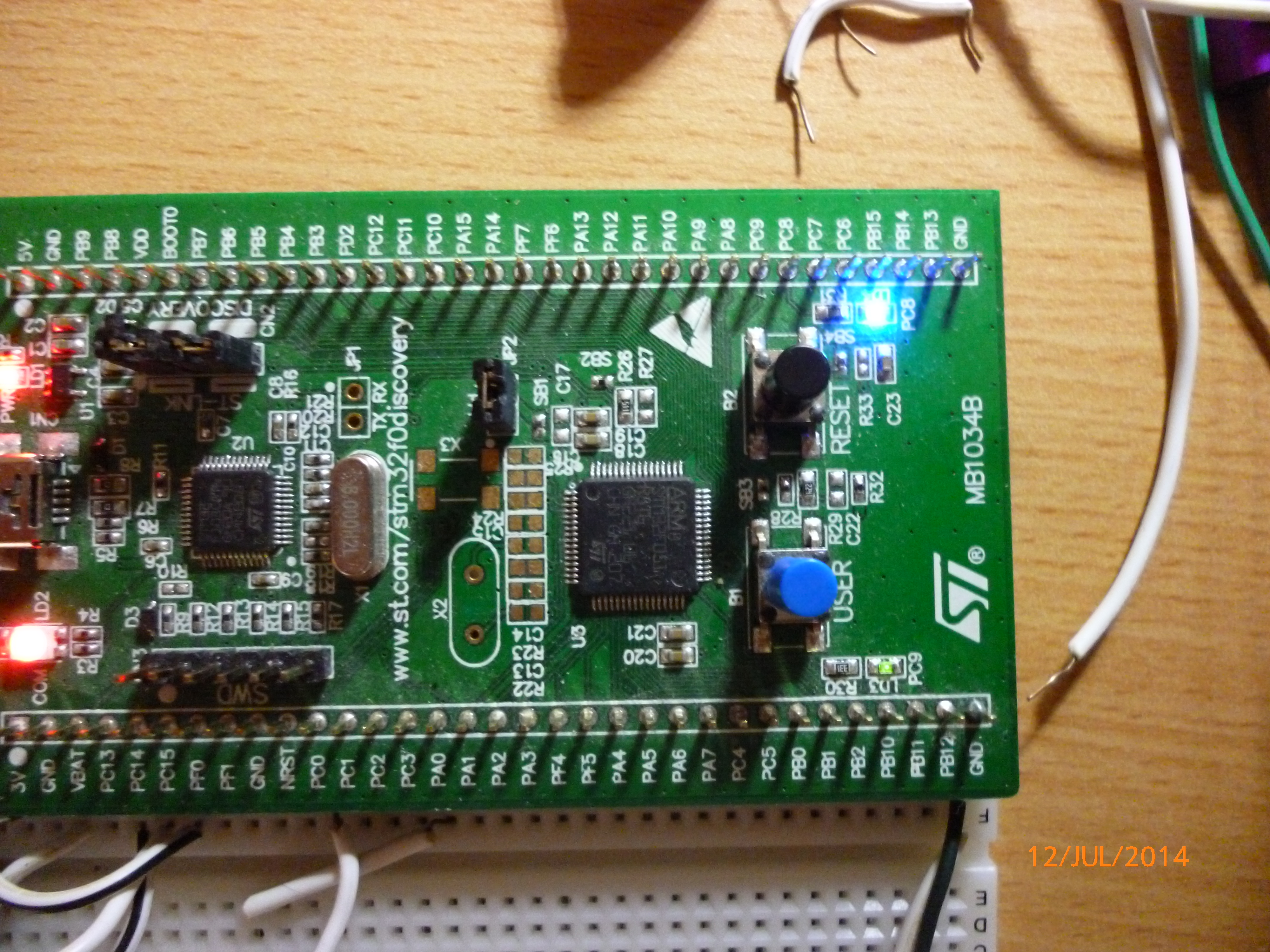STM32F0 discovery connected to my trusty breadboard! Ignore the wires below, they’re not related.