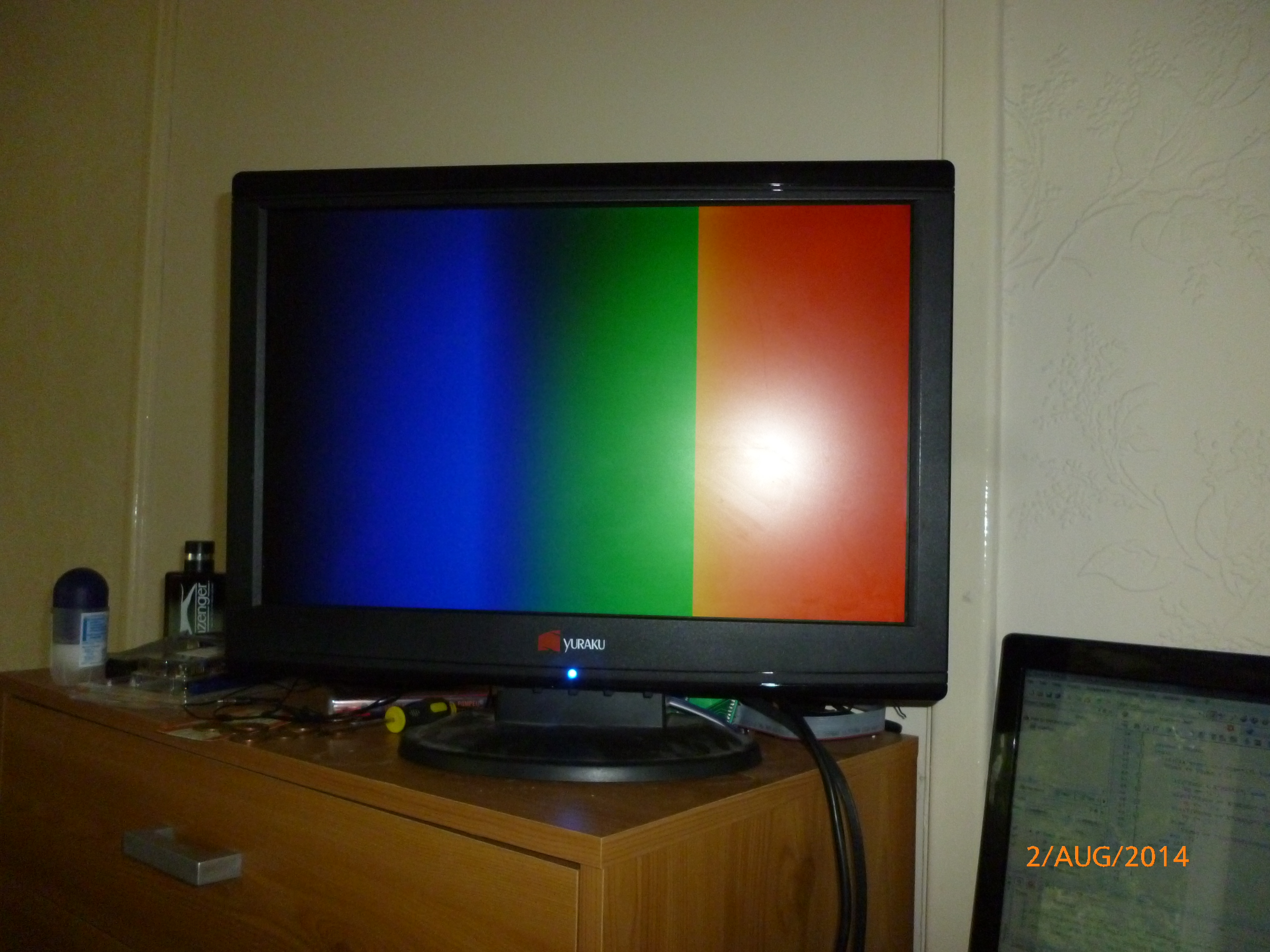 As this is essentially a 1 bit output DAC, I couldn’t really produce any cool colours so instead, I used a simple output low pass filter to produce colour gradients! By adding a 100nF capacitor after the 220ohm output resistor, a low pass filter is formed which charges and discharges the capacitor with respect to the position in the HSync. This therefore causes a gradient! I could do with adding a reverse biased diode across the 220ohm resistor to fast discharge this capacitor when the colour changes but i’ve not got round to this yet either (lots to do, such little time!).