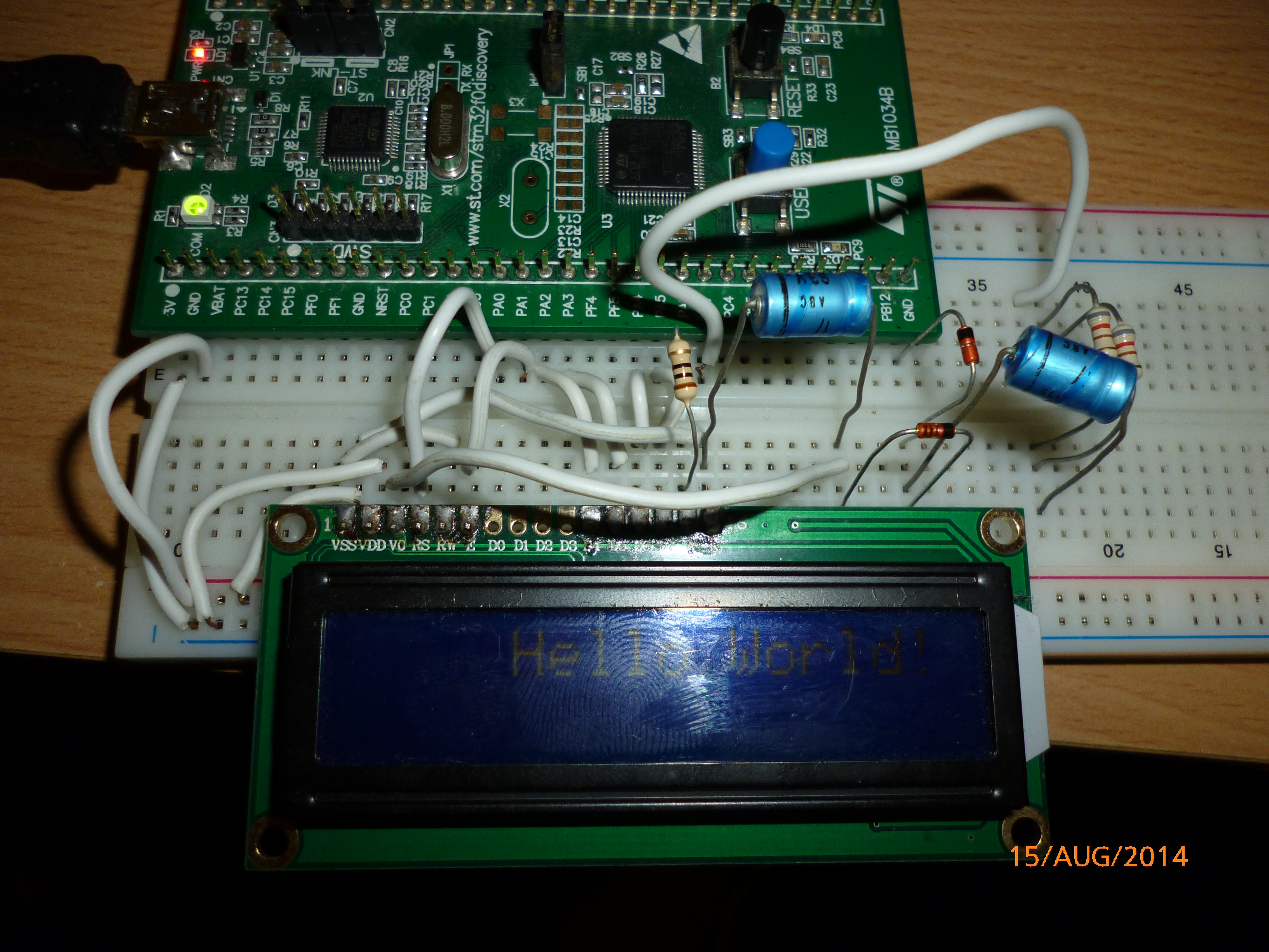 And voila! As I said in one of the last two posts (Initial post: https://hsel.co.uk/2014/08/14/stm32f0-discovery-board-and-the-hd44780-lcd/ and integrating a charge pump for backlight control: https://hsel.co.uk/2014/08/14/stm32f0-discovery-board-with-hd44780-and-integrated-charge-pump/), I’ve now included a generic LED backlight PWM controller using one of the standard GPIO pins. I’m using GPIOA Pin 6 to drive the LED backlight and I’ve integrated a 4bit (16 step) backlight control within software operating at a PWM frequency of 62.5hz. The PWM counter is implemented within the Systick timer loop, reducing the need for a seperate timer to be enabled, or any specific CC channels used. Theoretically, all the unused pins could be used as PWM outputs, though why you would want to do that, I don’t know! I’d say you could increase the speed at which the PWM runs but this would modify the rate at which the delay function works and that would be undesirable!