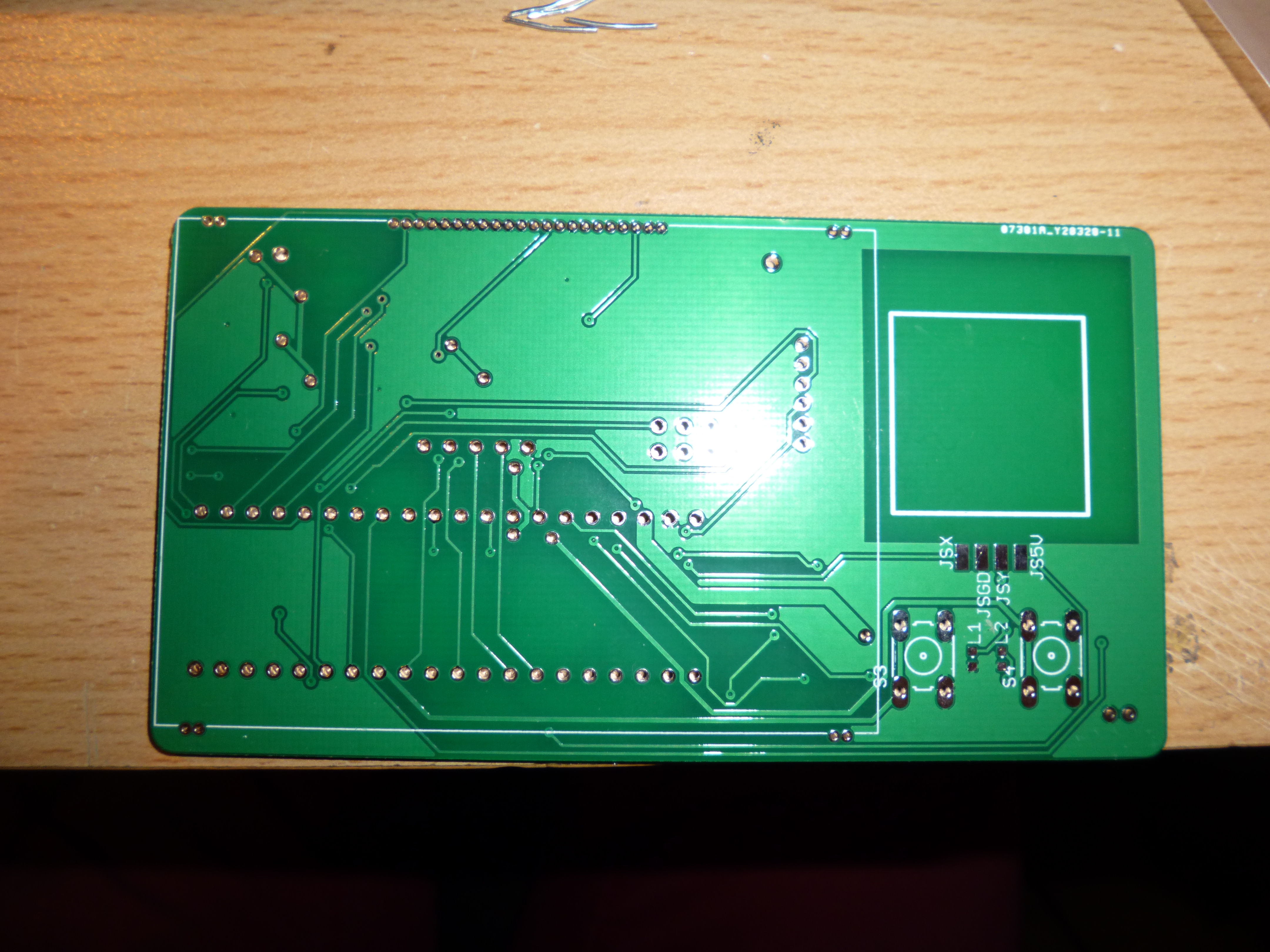 The rear side of the PCB. A few of the traces in the bottom left had been cut for insertion of extra components. I’m just waiting on the WiFi module now!