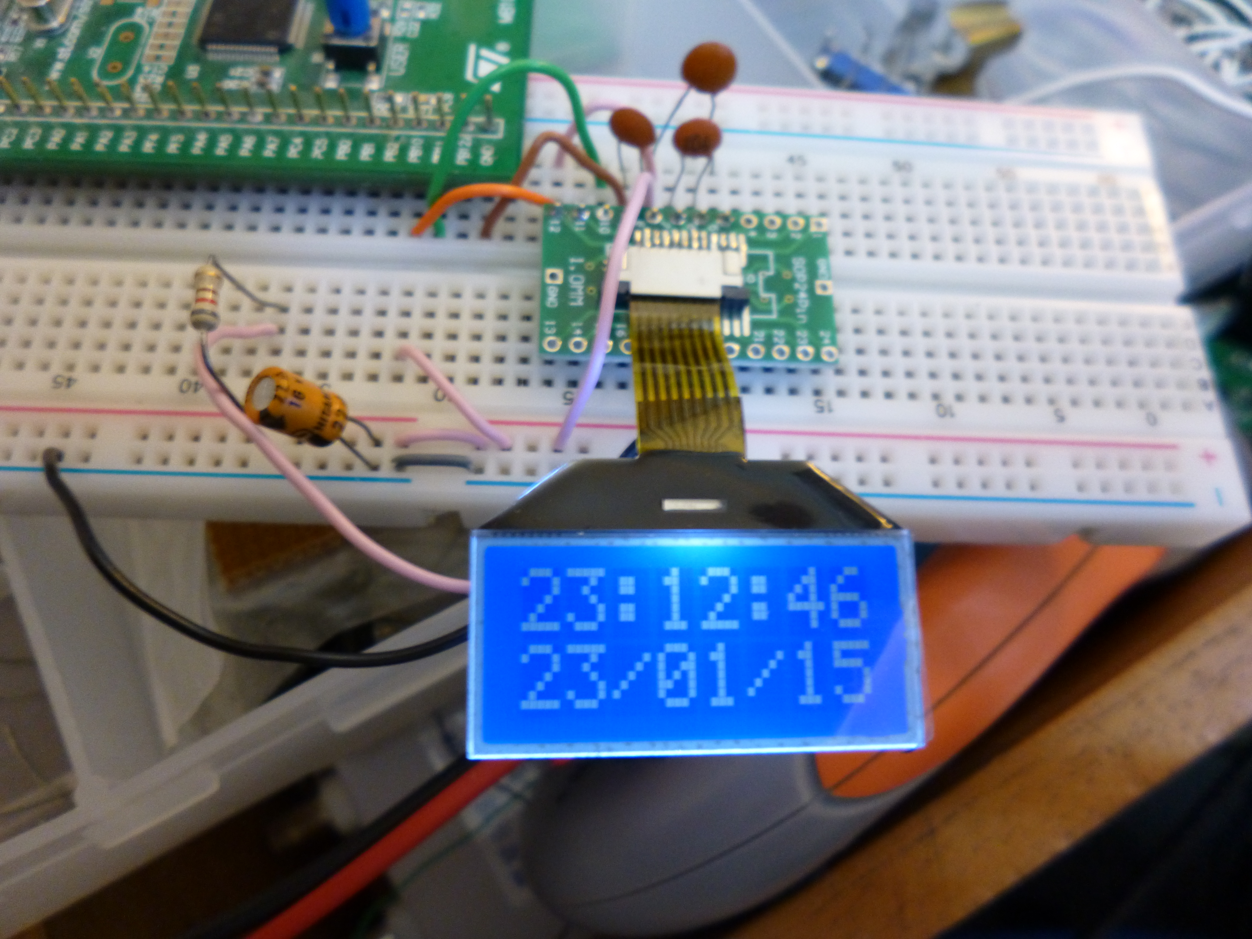 As you can see, its a pretty simple arrangement. Two wires for I2C, 3 capacitors for VLCD, the internal charge pump and the power supply, a jumper from reset to VDD, the backlight through a 100Ohm resistor and of course VDD and VSS for power. Its going to be quite a challenge making a meaningful smartwatch when you can only display 16 characters at once with 8 of them being per line!