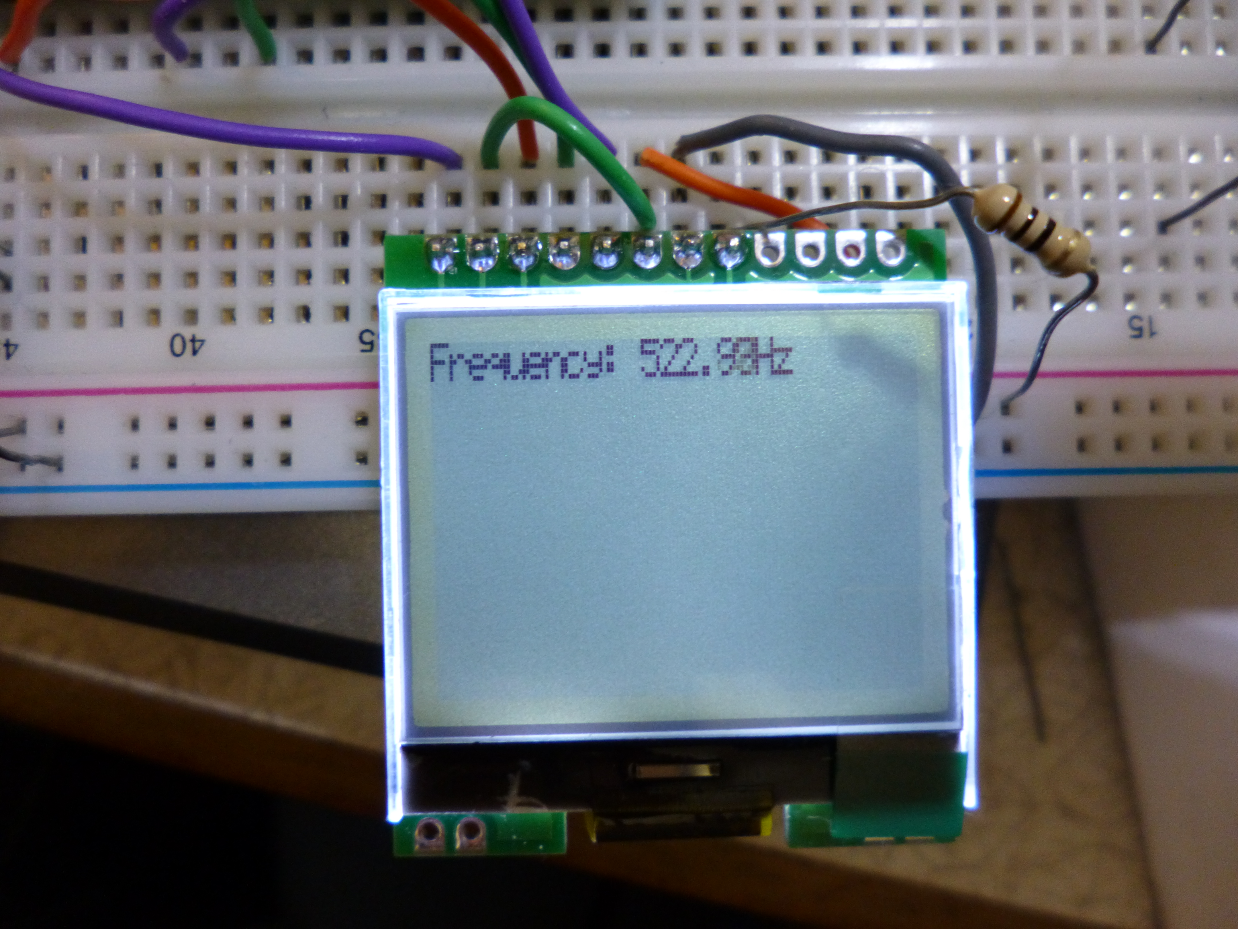 Reading the frequency off my LCD! A slight bit of error in the frequency compared to my oscilloscope (~2Hz) but not bad for a pretty simple piece of code!