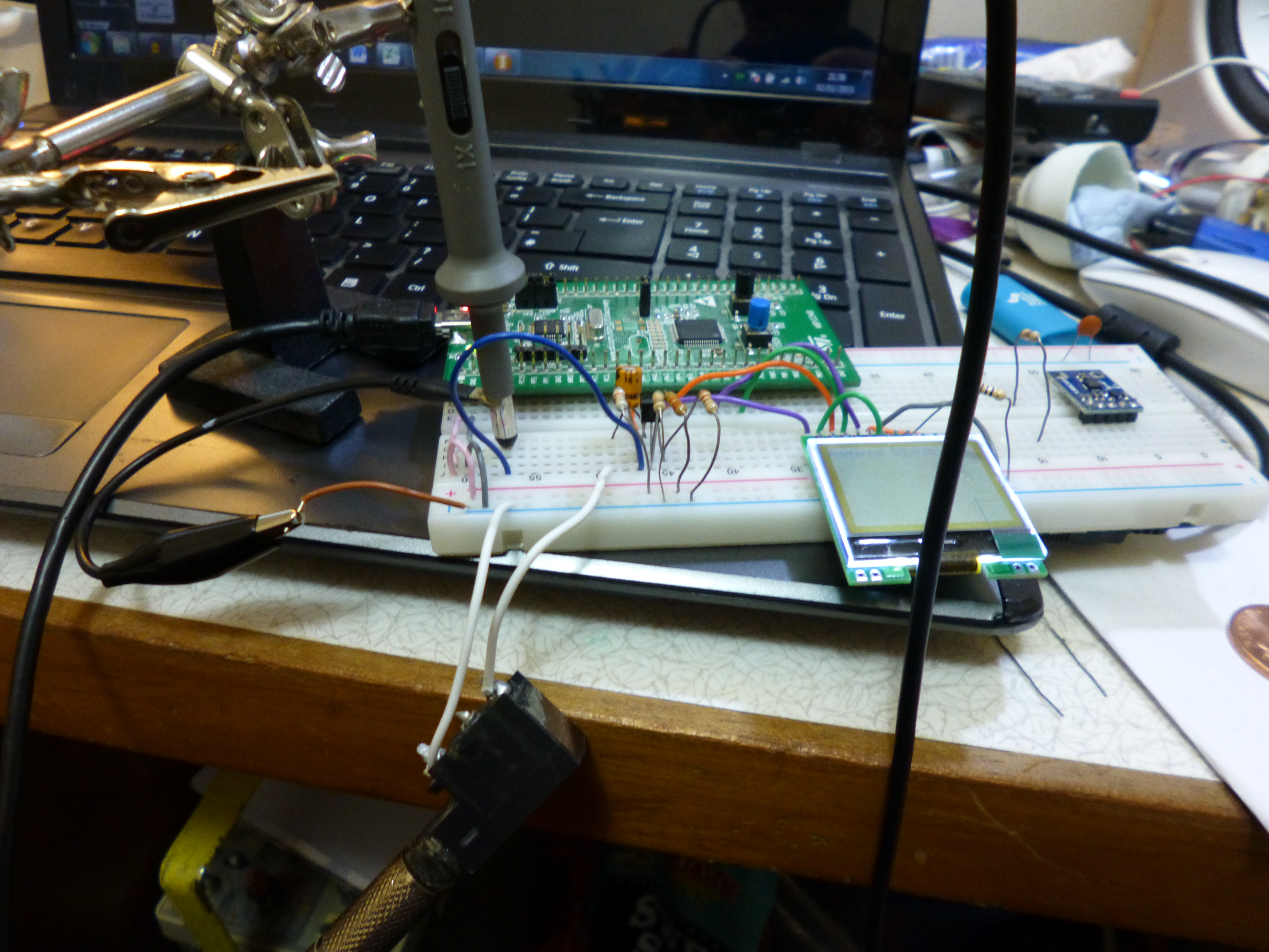 The whole setup! The small bit of circuitry is a transistor amplifier with the output DC coupled to the STM32F0 input, this provides DC bias required for the ADC to work correctly.
