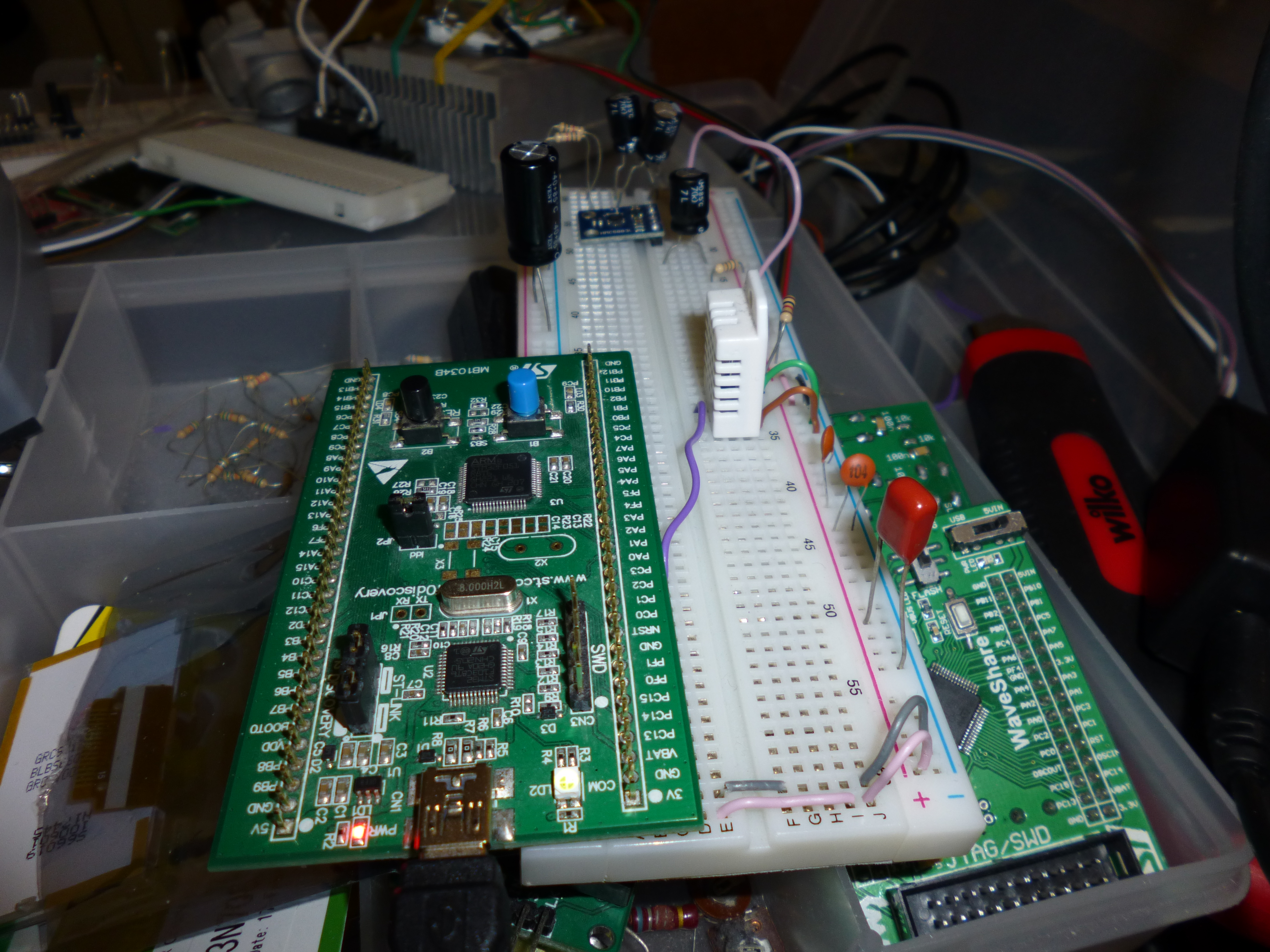Well tonight has been productive! I’ve managed to get the DS1307 working with my STM32F0 and now the AM2302! I thought that I’d actually done a previous post on interfacing the DHT11 humidity and temperature sensor but it turns out I hadn’t! The method of operation and data transfer is pretty much the same so it shouldn’t be too hard to modify the code to work between the two.