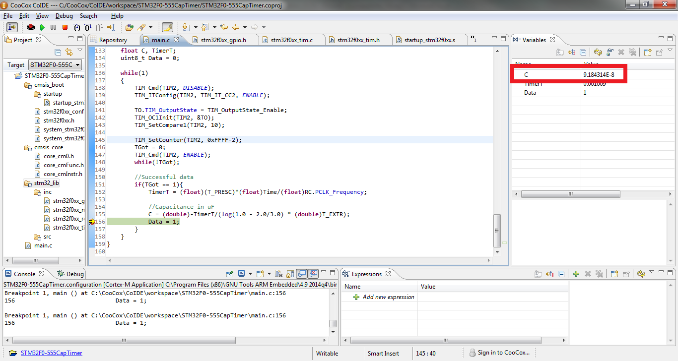 Reading the capacitance with no capacitor in also gives a result of 576pF. Hardly good for any precision measurements! If larger valued capacitors would like to be read, the prescaler should be increased to ensure the timer doesn’t overflow. In my program, I haven’t included an overflow management section of code so if you use my code, you’ve been warned! In my example, the trigger is connected to PA0 (TIM2 channel 1) and the pulse output is connected to PA1 (TIM2 channel 2).