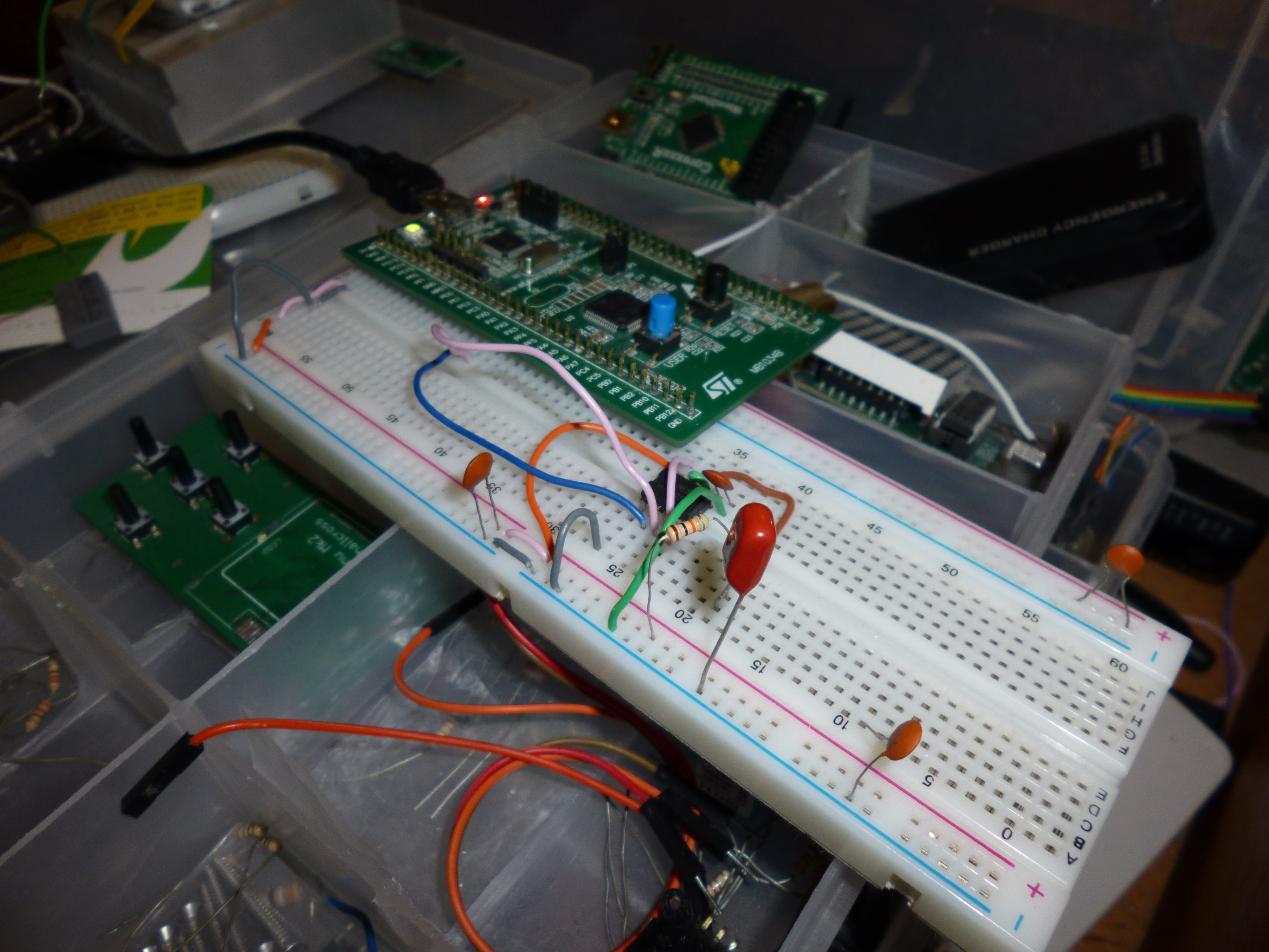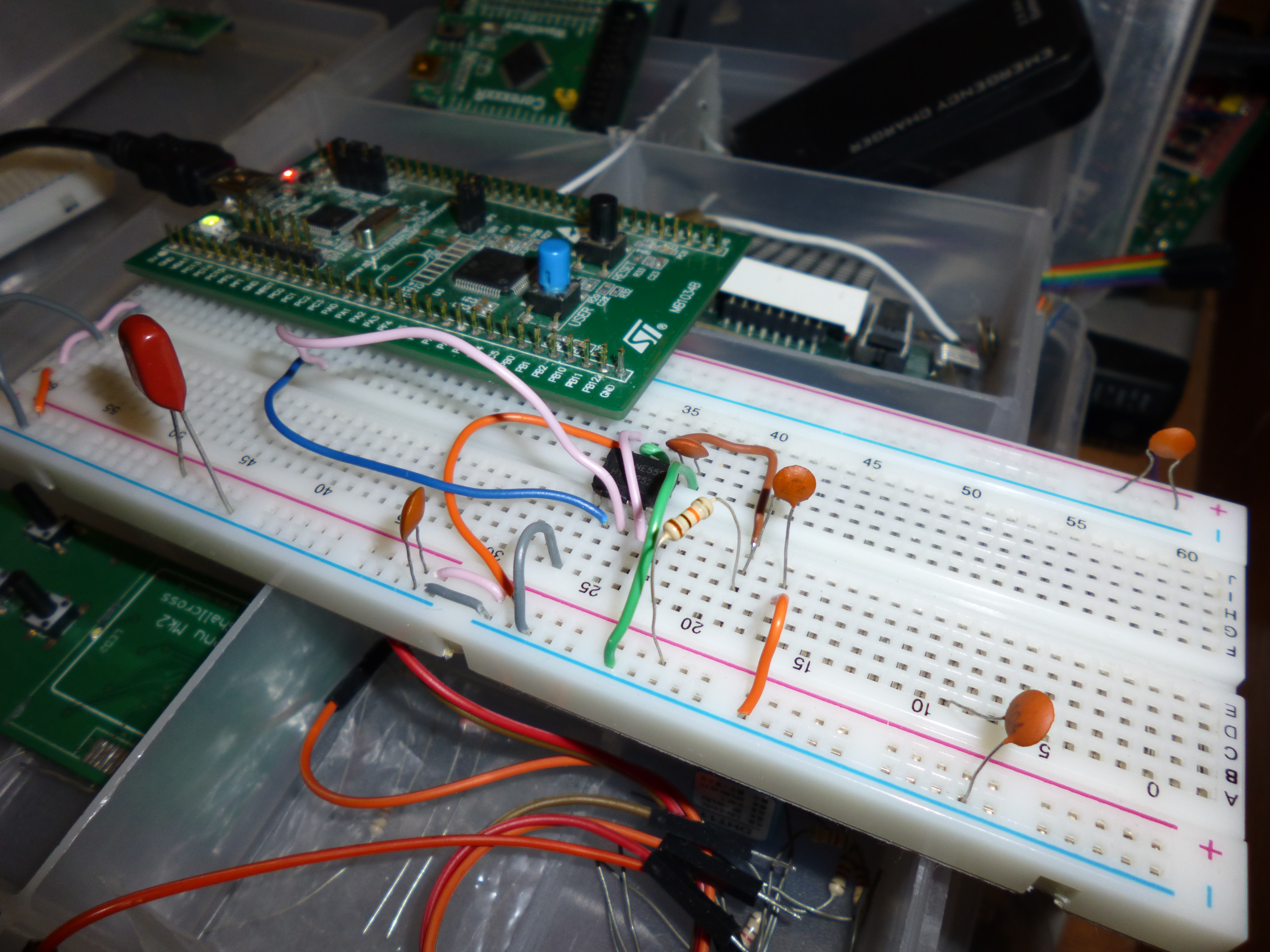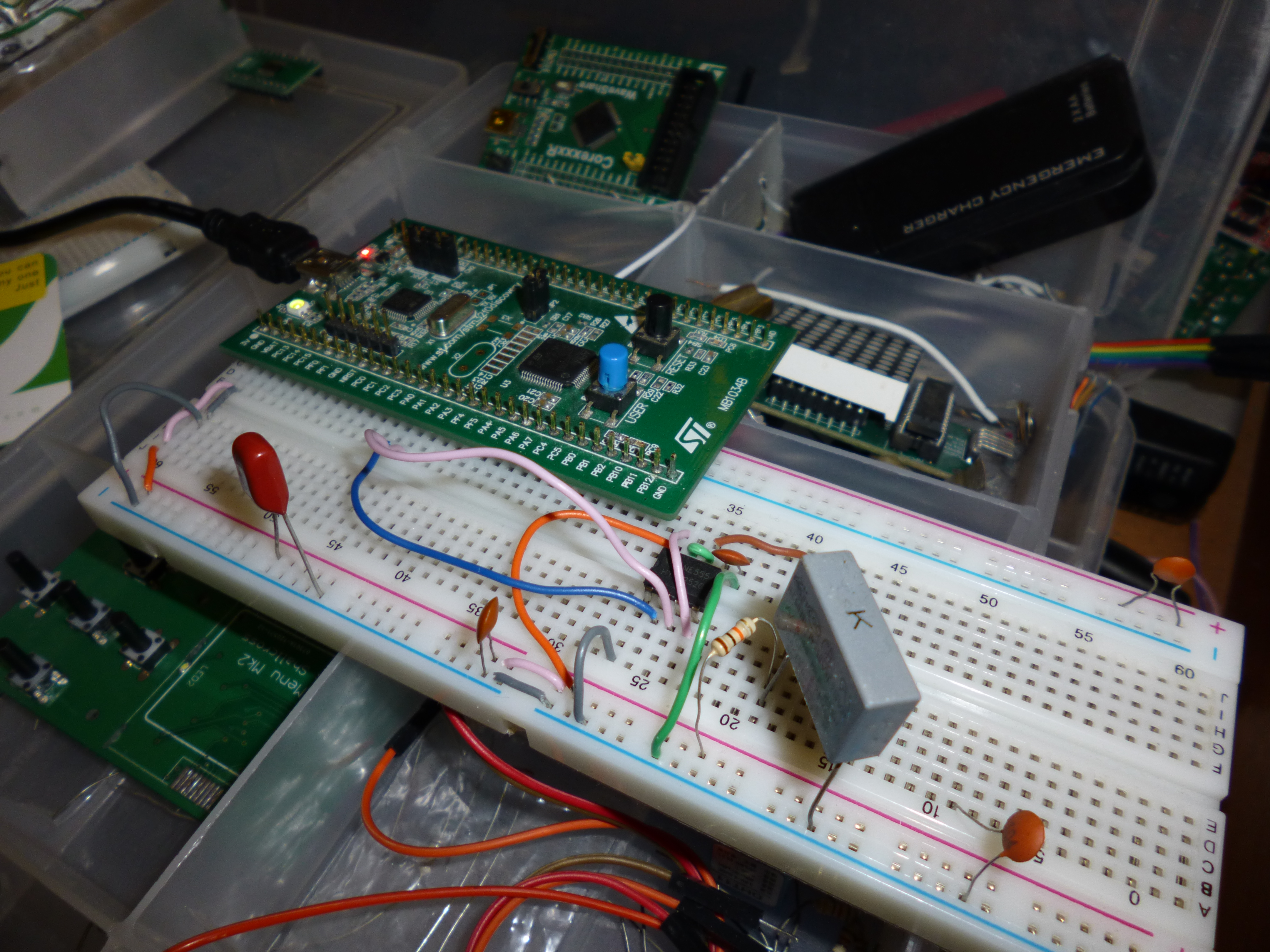 Yet another project with my STM32F0 discovery board… A simple capacitance meter! The value of capacitance can be determined by the time that it takes for a capacitor to charge through the resistor. A precise way to do this would involve using two comparators, 4 precision resistors (three for a precise biasing source and one to be used as a charge resistor), and a voltage regulator. By using a precise DC source and setting the comparison points at perfect intervals would give a much better result than the method I’m using. As I threw this circuit together in a few minutes, I’m using a 555 timer in monostable mode. The internals of a 555 timer actually involve two comparators and a few resistors to produce multiple comparison voltage levels.