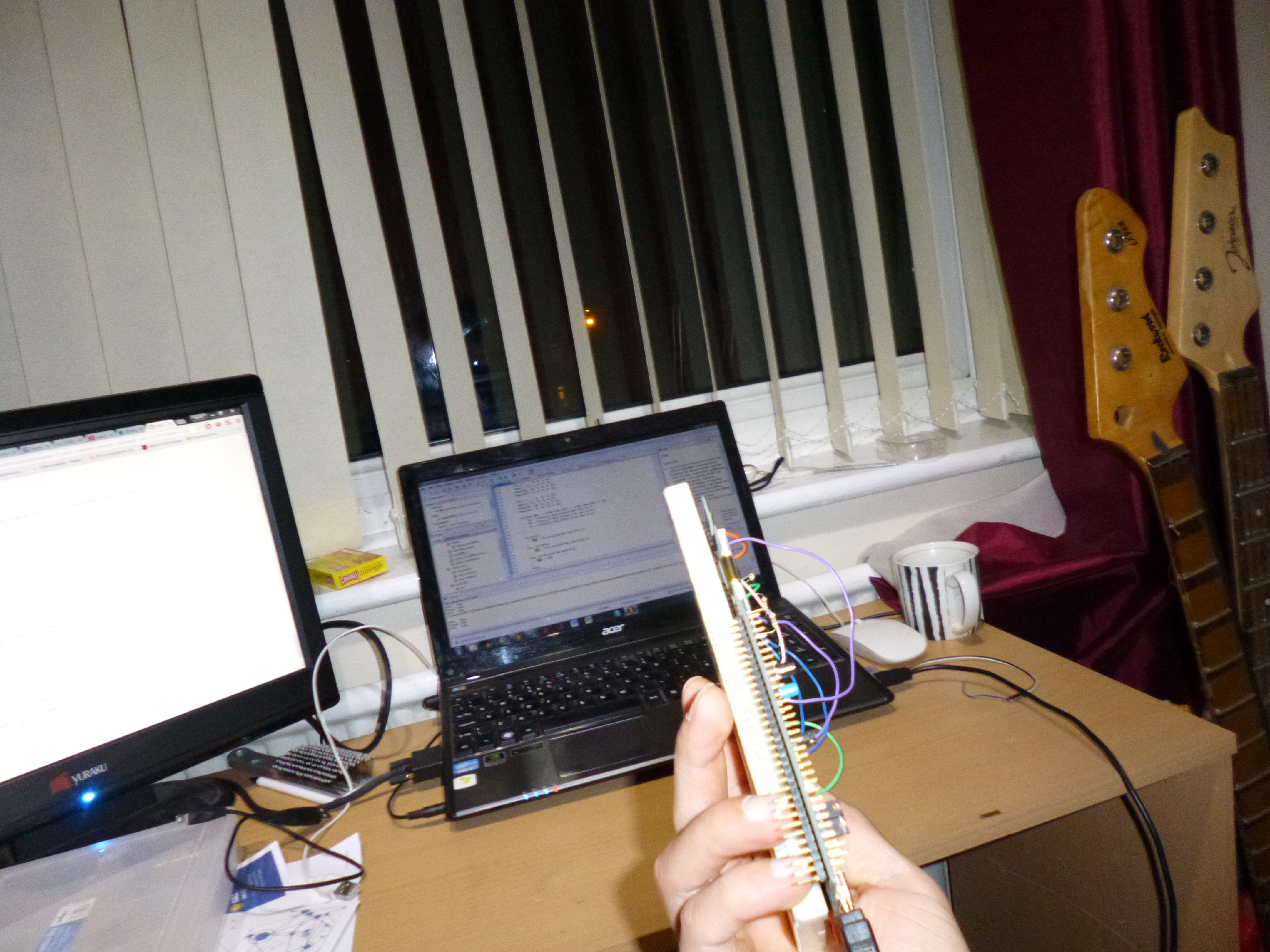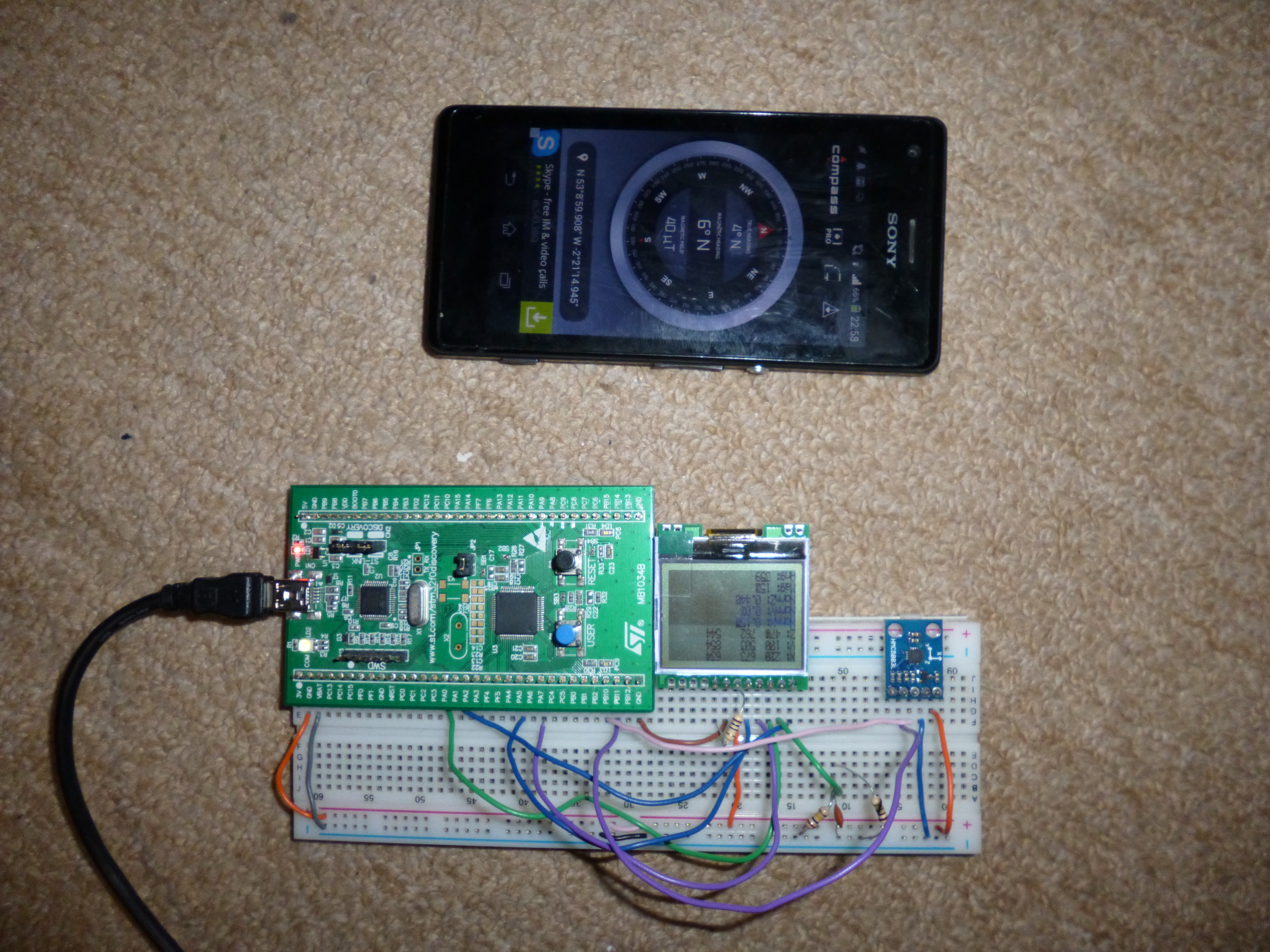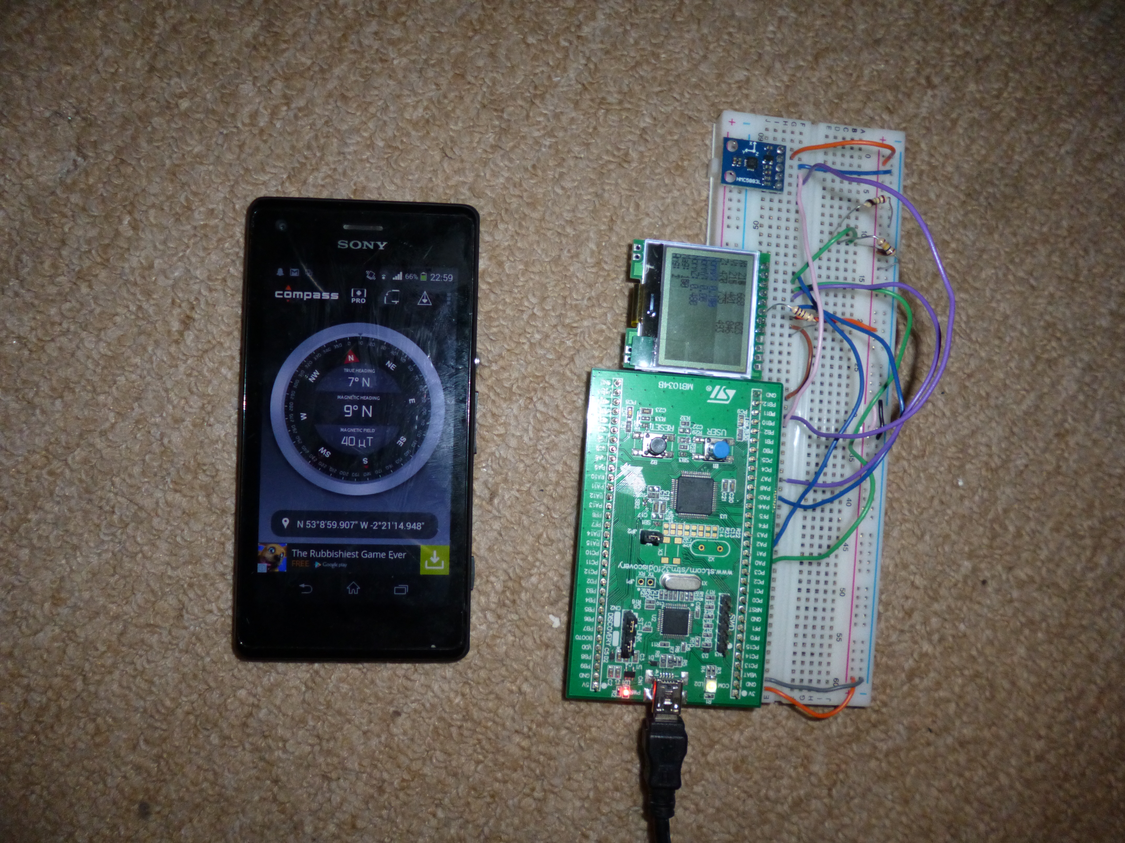 As you can see in the images above, I actually have both my phone and the board on my floor away from anything electrical. The reason for this is if I try and use it next to my laptop, the magnets within my hard drive actually have a large influence on the sensor creating a pretty erroneous result. On the floor, this problem is still present but less of an effect is measured as magnetic field strength decreases as a square law!