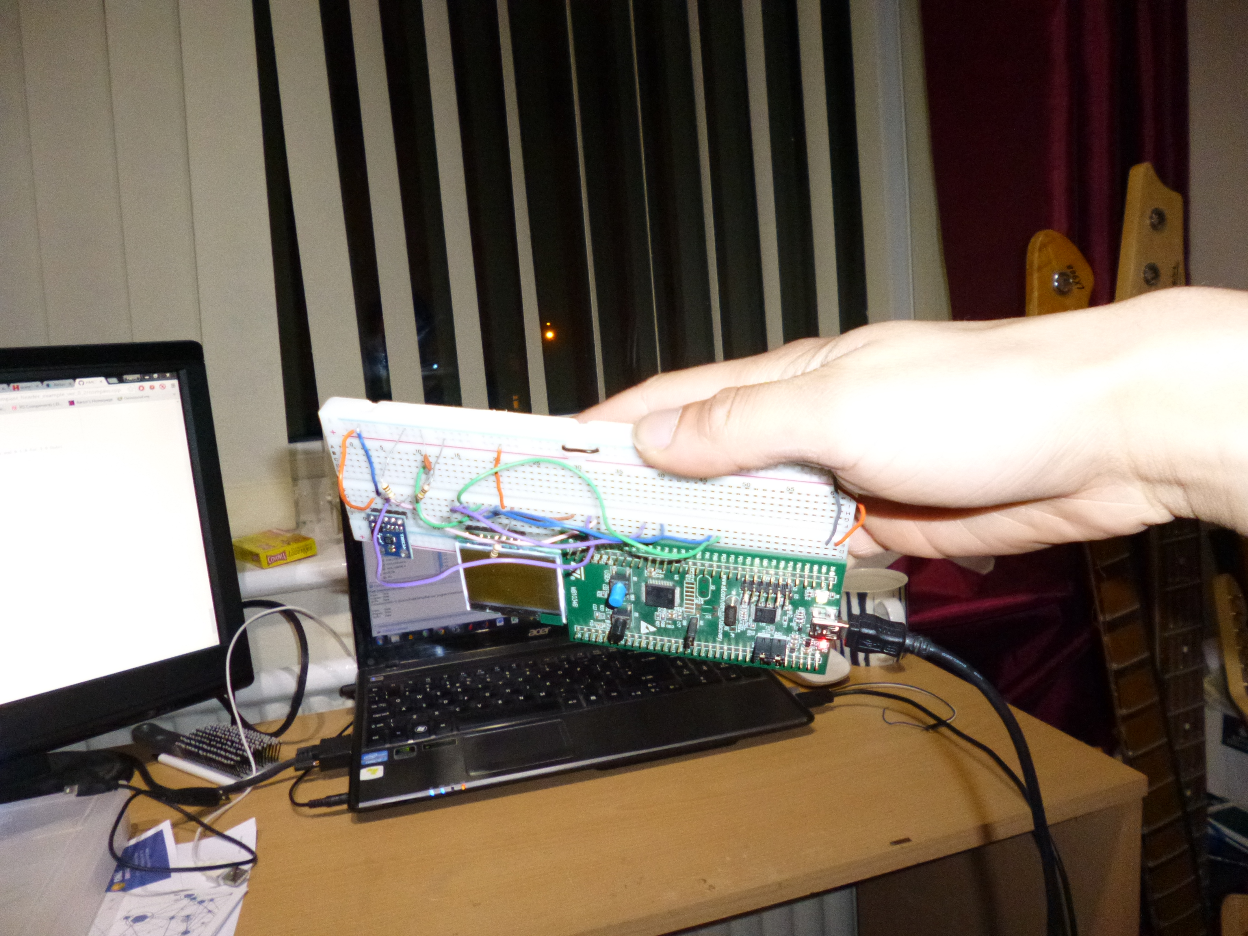 Obviously however, the compass module doesn’t work straight out of the box and requires calibration everytime I reprogram it. Calibration works through rotating it about the X, Y and Z axes in a point in space (preferably the point that you want to check your orientation at). I do this by grabbing the board and rotating it in every plane I can manage. This allows the program to find the maximum and minimum magnetic field strengths for that given point in each orientation. By knowing these maximum and minimum values, the current reading can then be normalised to the point where if the current magnetic field strength was equal to the minimum value, the normalised value would be zero, whereas if the current reading of the magnetic field strength was equal to the maximum value, the normalised value would be one. By using these normalised value, one can calculate the vector corresponding to north in 2D space, ensuring the sensor is kept flat.