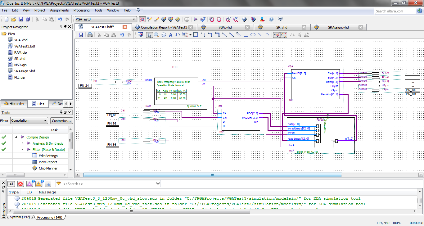 Well, this week so far has been very productive with regards to electronics! This is a project I’ve been wanted to do for ages just haven’t got round to doing. I’ve previously designed VGA controllers on both my CPLD and my FPGA board but I’ve not actually done anything useful other than design a bouncing box and display a few colour bars so I finally thought: why not actually try developing a full graphics controller, how hard can it be?!