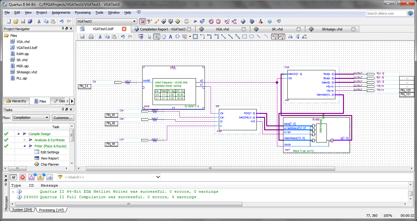 Dual port SRAM is by far the easiest method of allowing both read and write operations at the same time giving a layer of separation between the shift register interface and the VGA controller. This drastically simplifies potential synchronisation problems that may become present when trying to read and write a single port SRAM at the same time. The problem here however comes with larger occupied space and increased complexity in manufacture. Fortunately for me, the FPGA I’m using (Altera Cyclone IV EP4CE6E22C8) features onboard memory blocks, allowing me to store the whole frame buffer for a 100×75, 8bit pixel screen on the FPGA. If more memory was available, I would be able to store the whole 800×600 pixel frame buffer but the amount of space increases dramatically with increasing screen sizes! I need 7,500 bytes to store a 100×75 8 bit frame buffer whereas I need 480,000 bytes to store a 800×600 8bit frame buffer! In the future, I might replace this for an SDRAM interface for my onboard SDRAM, allowing me to store the full frame buffer.