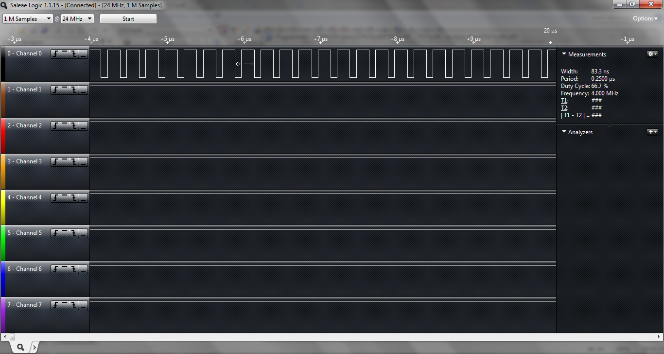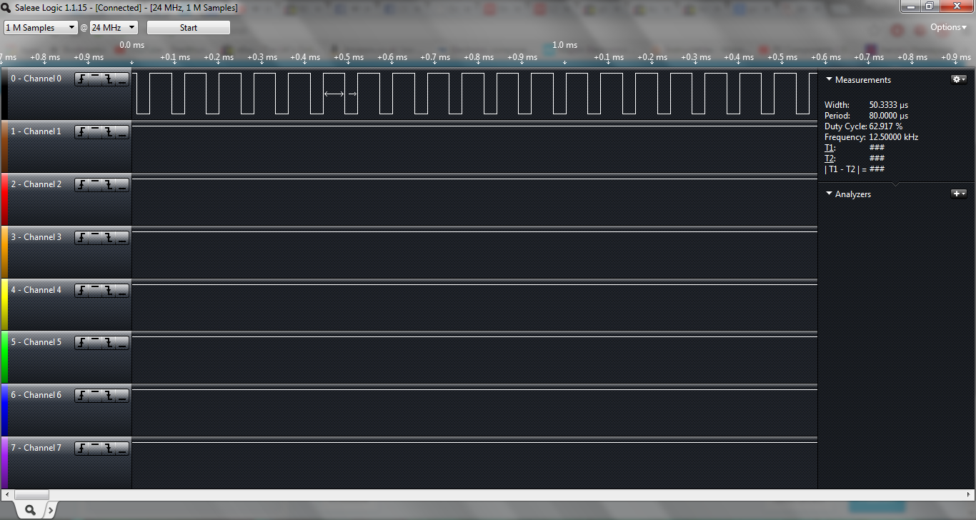Finally, the smallest achievable pulse width is obtained through setting the comparison value to 1. This equates to a pulse of width 0.625us which is probably more of an aliasing issue with my logic analyzer.