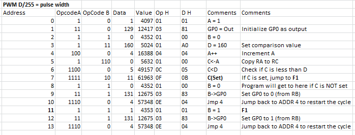 This is relatively easy to implement on my microcontroller and can be done in 13 instructions. The instruction count would increase however if you wanted to reduce the PWM resolution (e.g. overflowing at a lower value instead of 255). Some care needs to be taken when doing register comparisons (equal, more than and less than) as if the check is true, the whole register gets set, overwriting what was previously in the register. This is a problem here as whenever the counter (Register A) is less than the compare value (Register D), A should set to 255 when the less than instruction is executed which is bad as that will loose our position on the PWM count! This is solved by writing register A to register C and doing the comparison between register C and D. This is fine as register C isn’t used for any of the the PWM generation and was essentially a spare register.