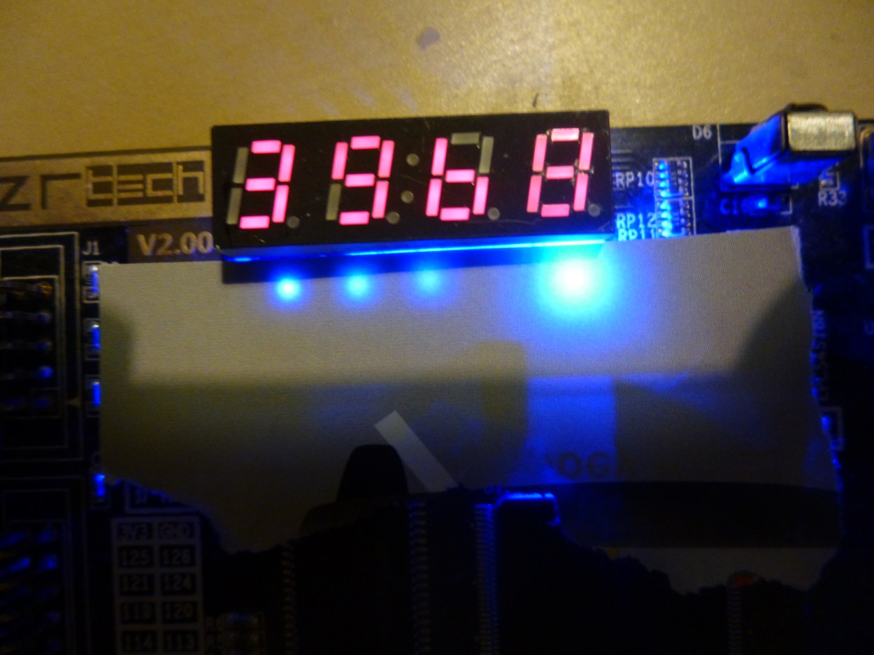One useful addition is a 7 segment controller. My FPGA board features a 4×7 segment LED allowing the display of 16bit numbers in hex (0x0000 to 0xFFFF). I’ve not implemented the decimal point LEDs so only digits 0 to F can be displayed.